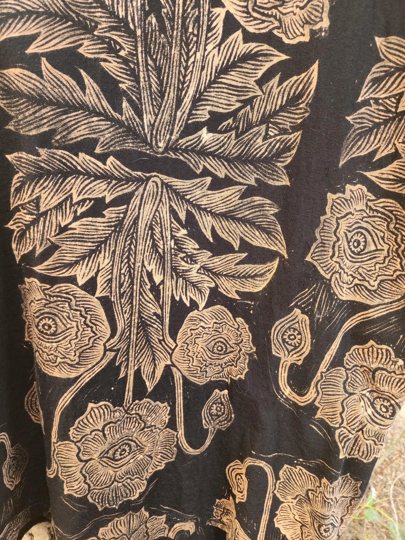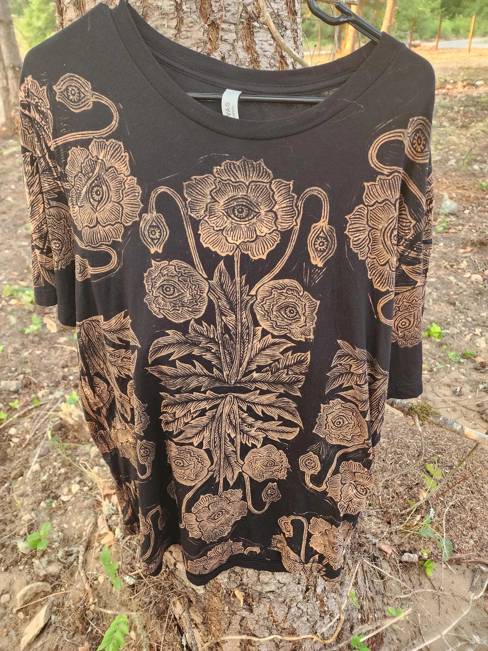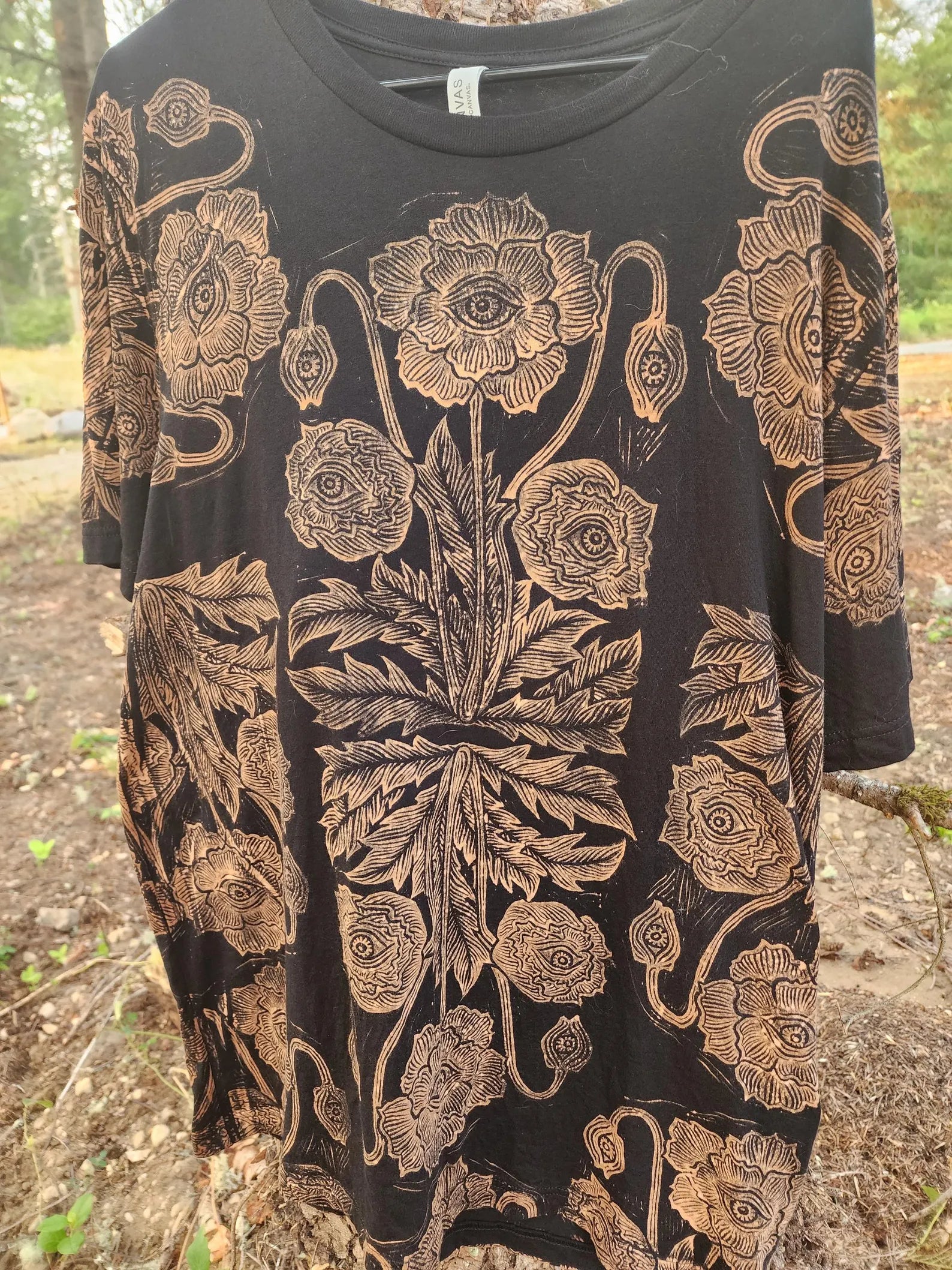 ❧Hand carved eyeball poppies printed with bleach on a black T-shirt