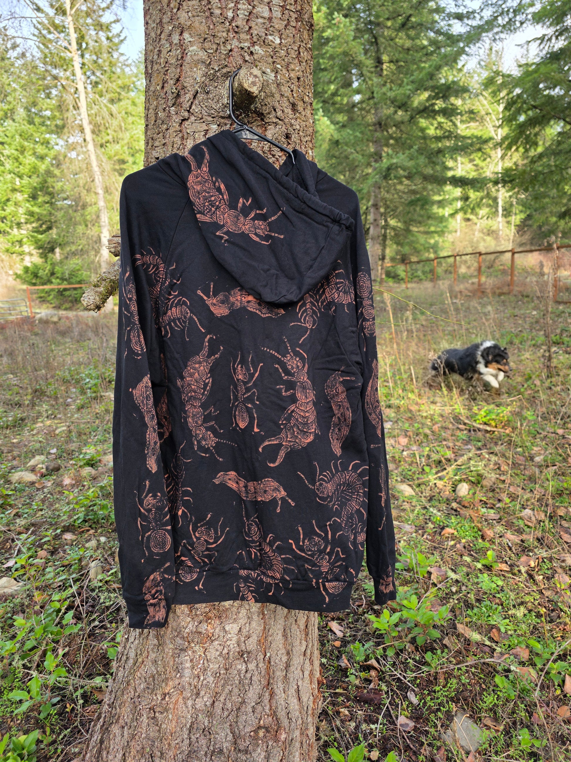 ❧ Hand carved ants, earwigs, centipedes and slugs printed with bleach on a black hooded zip sweatshirt. The design is printed on both the front, back, sleeves, and hood of the shirt.