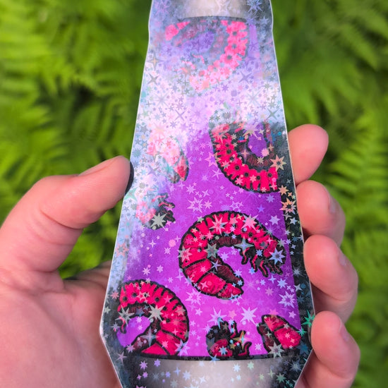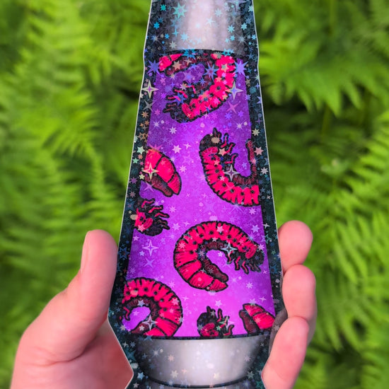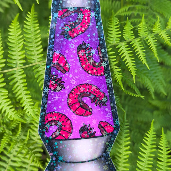 Super sparkly (with holographic stars!!) sticker with a "larvae lamp" design. This one's big, about 5" tall. Sturdy vinyl Sticker construction, waterproof, can withstand being on a car, put through the dishwasher etc.