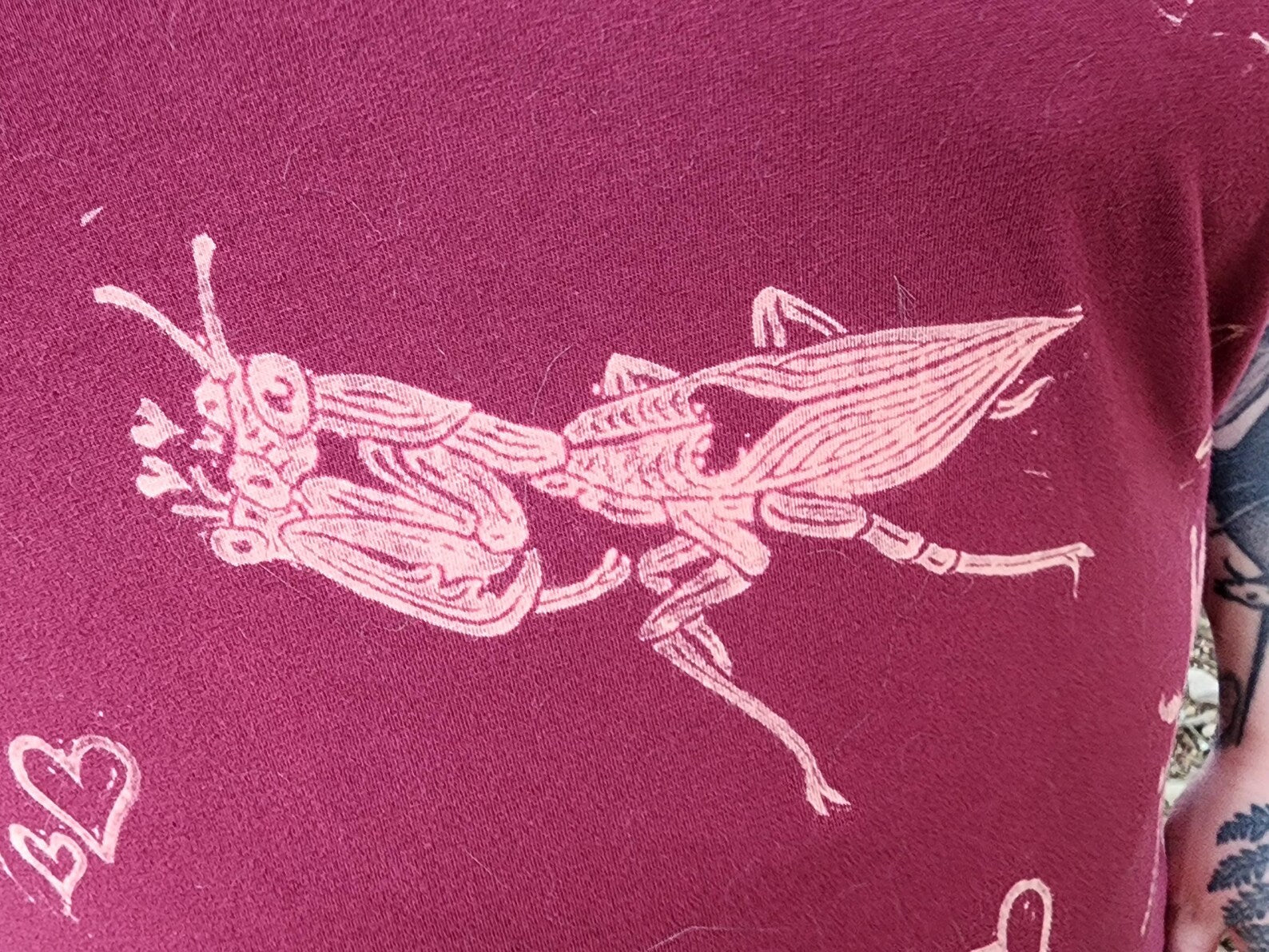 ❧Hand carved slugs, beetles, mantids and dragonflies all having a very good time, special for valentine's day, printed with bleach on your choice of cardinal (lighter) or burgundy (darker) red T-shirt. The cardinal prints to a very pinky pink color and the burgundy prints to a more orangey peach color. See photos, but keep in mind that due to lighting/digital screen capabilities/overall wild nature of bleach printing, it may vary.