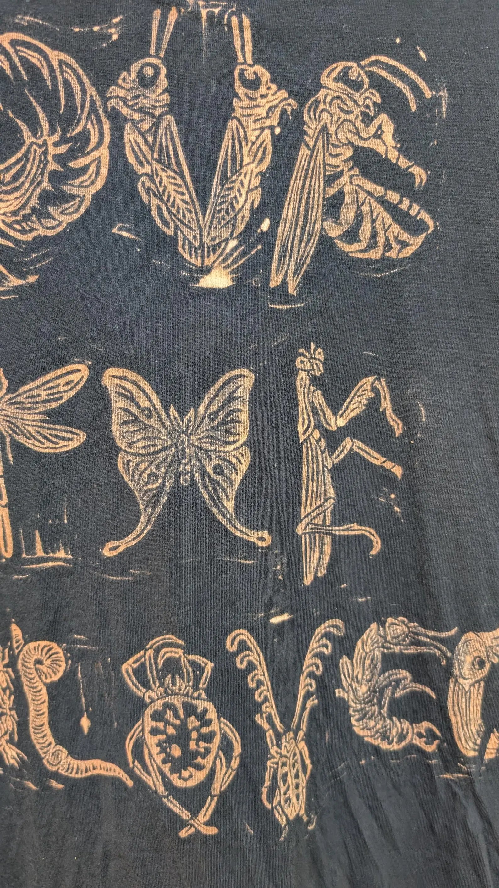 ❧Hand carved bugs spelling out the text "Love The Unloved" printed with bleach on a black T-shirt with option for bug party on the back side (business in the front, bug party on the back)